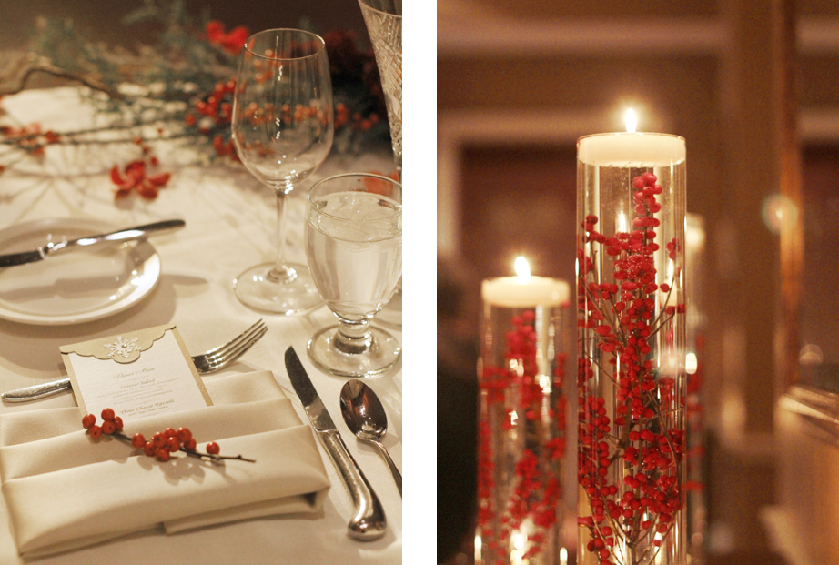 I am really into the trend of using fruit-based centerpieces as an alternative to the more traditional floral pieces. Depending on the season and the type of centerpieces you are interested in using, there are many ways to incorporate this trend into your decor. For winter weddings, cranberries are perfect to use at the bottom of candles, within traditional flower vases, as well as placed gently around the table. Cranberry is a bold and elegant color choice for winter weddings. It pairs well with soft ivory, champagne, light gray/silver, and pine. For brides looking to incorporate cranberries to add romance and whimsy or to play up the holidays during their winter wedding, here are some great decor ideas to consider:
