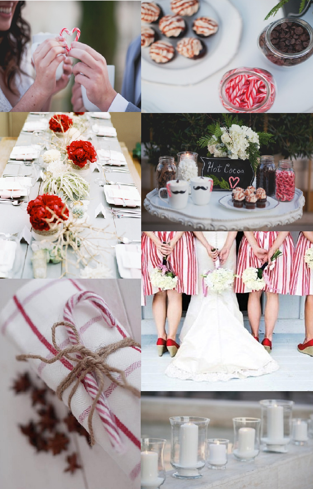 Photos – 1) Bride and Groom holding Candy Cane, 2) Candy Table, 3) Hot Chocolate Bar: stylemepretty.com, 4) Red-and-White Striped Bridesmaids Dresses: theknot.com, 5) White Candles: stylemepretty.com, 6) Napkin with Candy Cane Favor: bijouxbride.com, 7) Light Gray Table with Red and White Winter Decor: brides.com