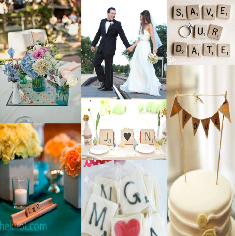 Photos – 1) Scrabble Board and Flower Centerpiece: greenweddingshoes.com, 2) Bride and Groom holding hands, Scrabble Wedding: stylemepretty.com, 3) Save the Date: jenicasparks.com , 4) Cake Topper: Pinterest.com, 5) Scrabble Cookie: bakeat350.blogspot.com , 6) Scrabble Pieces on Bride and Groom Table: stylemepretty.com 7) Scrabble Table Number: theknot.com