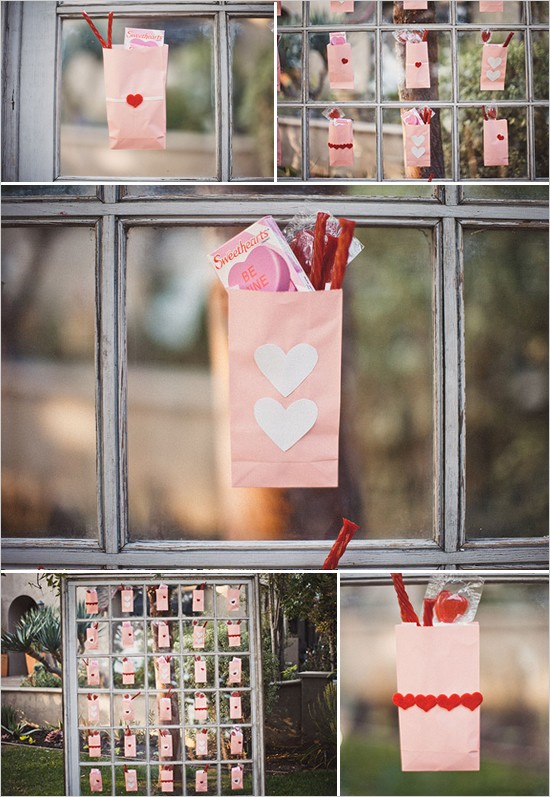 Hanging Valentines Treat Bags on a Display with your Placecards (weddingchicks.com).