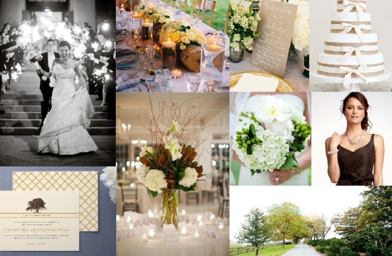 Photo Board 1 – 1) Ivory and Green Table with Ivory and Green Flower Arrangement: iloveswmag.com, 2) Woodlawn Manor: facebook.com/pages/Woodlawn-Manor, 3) Champaign Flutes and 4) Gold Frame Menu: pinterest.com, 5) Mr&Mrs Sign: allyouneedisloveevents.com, 6) Wedding Sign: stylemepretty.com, 7) Brides Bouquet – pinterest.com, 8) Mini Pies: .taraguerardsoiree.com, 9) Placecard Table: pinterest.com