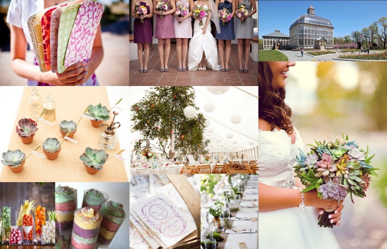 Photo Board 1 – 1) Colorful Wedding Fans, taylormade-weddings.com, 2) Bridal Party in Shades of Purple, Blue, Silver, greenweddingshoes.com, 3) Rawlings Conservatory, rawlingsconservatory.org, 4) Colorful Succulent Bouquet with Greens and Purple, lavenderandash.blogspot.co.uk, 5) Succulent and Moss Table Scape, ohsobeautifulpaper.com, 6) Purple Program, stylemepretty.com, 7) Colorful Push Up Pop Cake, cookiesandcups.com, 8) Veggie Display, tumblr.com, 9) Succulent Favors/Escort Tags, greenweddingshoes.com, 10) Garden Tent, blog.weddingwire.com