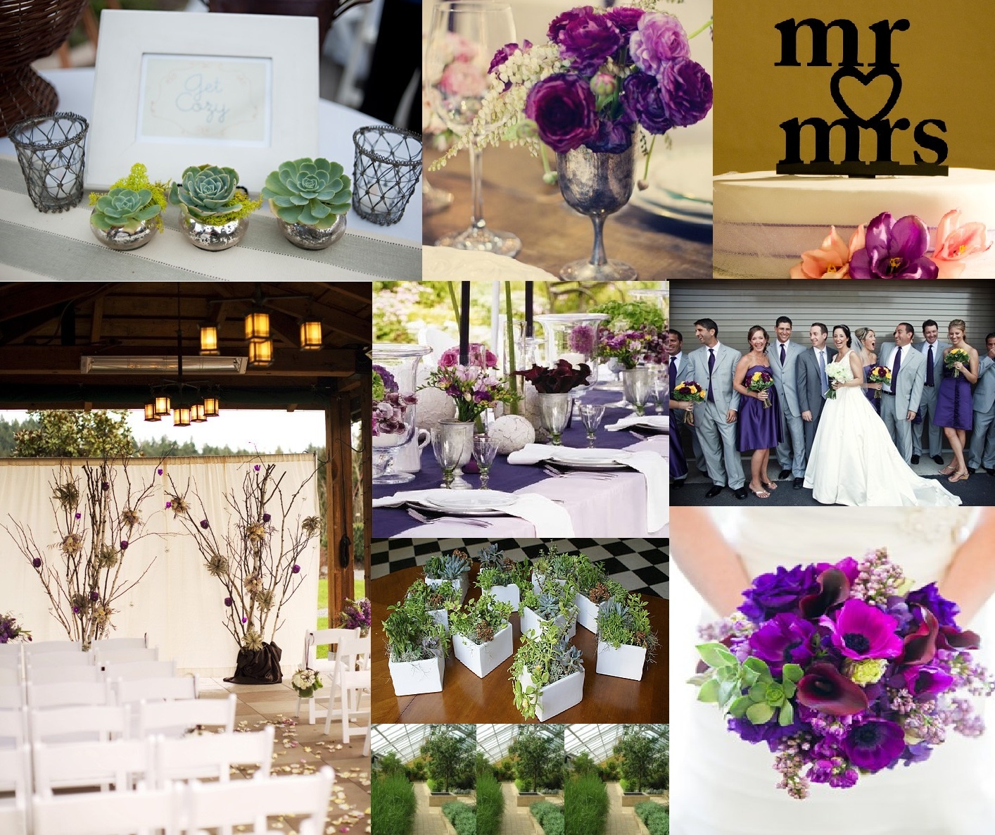 Photo Board 2 – 1) Silver and Succulents, stylemepretty.com, 2) Dark Purple and Silver Goblet, theweddinghunter.com, MR & MRS Cake Topper, etsy by oklahomastencil, etsty.com, 3) Purple and Gray Wedding Party, theperfectpalette.com, 4) Vibrant Purple and Succulent Bouquet, coryryan.com, 5) Inside Rawlings, rawlingsconservatory.org, 7) Ceremony Decor with Branches, Succulents and Pops of Purple Flowers, weddingsinwoodinville.com, 8) Succulent Centerpieces, casasugar.com, 9) Purple and Silver Table, comfortandluxury.blogspot.com