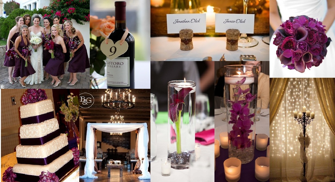 Photo Board 1 – 1) Bridal Party, theknot.com, 2) Wine Bottle and Heart Table Number, modernhostess.net, 3) Cork Placecards, bellemaison23.com, 4) Bridal Bouquet, projectwedding.com, 5) Ceremony back-drop with Candles and Icicle Lights, pinterest.com, 6) Submerged Orchids Centerpiece and 7) Submerged Cala Centerpiece, weddingbee.com, 8) Fabric Chuppah, ebelllosangeles.wordpress.com, 9) Wedding Cake with Eggplant Ribbon and Dark Purple/Wine Colored Hydrangea, onlinevintageinfo.blogspot.com