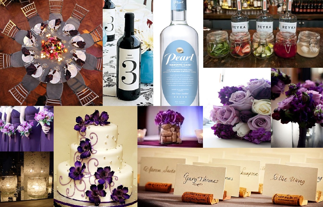 Photo Board 2 – 1) Table With Gray Linen and Eggplant Flowers, contemporarybride.com, 2) Wine with Table Number Label, marthastewartweddings.com, 3) Pearl Wedding Cake Flavored Vodka, pearlvodka.com, 4) Vodka Tasting Bar, pinterest.com, 5) Bridesmaid Bouquet, erinvolantefloral.blogspot.com, 6) Bridal Bouquet, community.i-do.com.au, 7) Flower and Cork Display, bing.com, 8) Wine Cork Placecards, evrimgallery.com, 9) Wedding Cake, cakesbydonna.com, 10) Lace Votives, blog.weddingpaperdivas.com, 11) Bridesmaids, weddingtips.tk