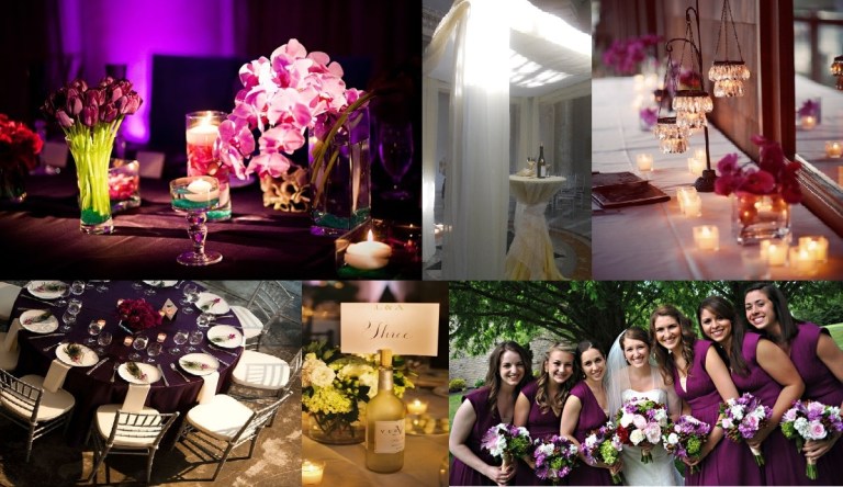 Photo Board 3 – 1) Burgundy and Eggplant Color Block Centerpieces, 3.bp.blogspot.com, 2) Organza Fabric Chuppah, Photography by Kate Pelura, thebrightoccasions.com, 3) Hanging Votices Escort Card Table, thetreasuredpetal.files.wordpress.com, 4) Bride with Bridesmaids in J.Crew, stylemepretty.com, 5) Wine with Table Number, elizabethannedesigns.com, 6) Table with Eggplant Linen and Burgundy Flowers, purespaceportland.com