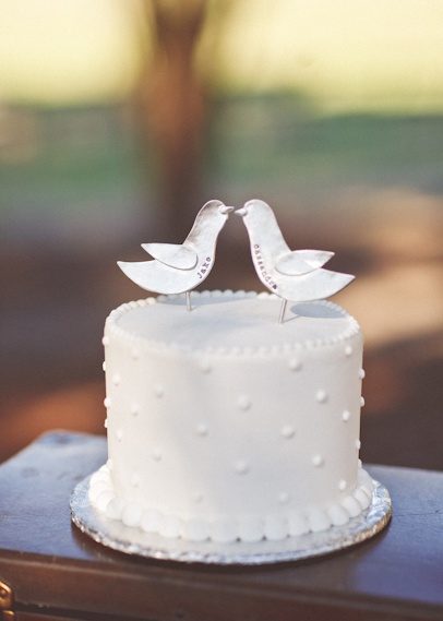 There is something so pretty about an all white wedding. While white weddings can work throughout the year, I love it for an outdoor summer celebration. The inspiration board I created below was inspired by the sweet wedding cake topper below. Which would be perfect for an intimate party under sparkling lights, with bridesmaids in white, full white flowers, and touches of nude, brown and silver.
