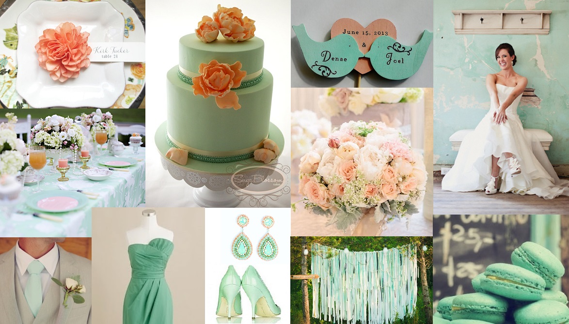 Lately I am seeing Mint and Peach wedding details all over Pinterest and my favorite wedding blogs. I love this color combination for romantic weddings with vintage details. I created my Mint and Peach Wedding Inspiration board for couples planning a Spring or Summer Wedding. Enjoy!