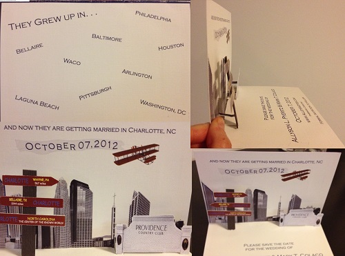 With so many save-the-date ideas shared online, it’s hard to be truly one-of-a-kind. But here is a save-the-date that is like none I’ve seen – it’s actually a pop-up card. The couple worked with the designer to create their custom 3D save-the-date.