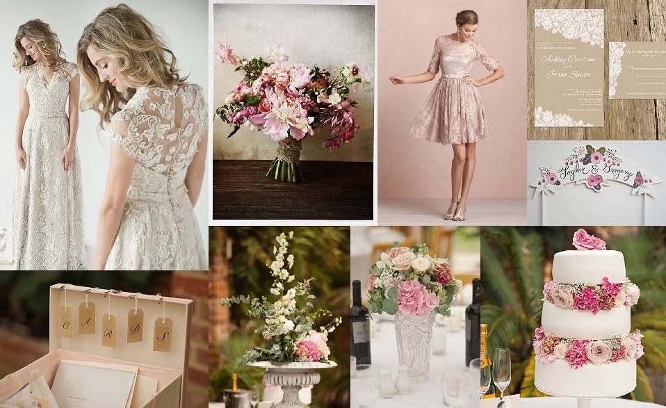 When it comes to weddings, pink and lace will always be “in” – it is a romantic and timeless combination. Lace details have been very much on trend this year, and not just for the bride’s dress. We have seen lace bridesmaids dresses, lace details on invitations, wedding cakes and more. I love the combination of ivory lace, pink and dusty rose for a beautiful antique look. Here is my Dusty Rose and Lace Wedding board: