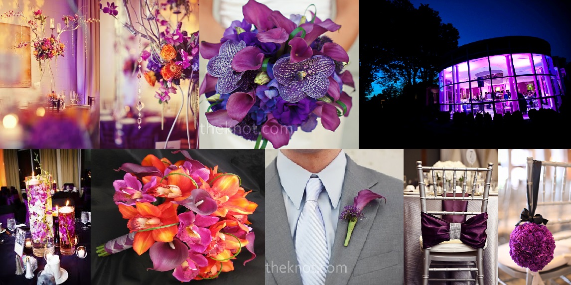 Photo Board 2: 1) Ceremony Arrangement with Purple, Fuchsia and Orange Flowers and Silver Branches, michaeldaigian.blogspot.com/2010_08_01_archive.html, 2) Bridal Bouquet, theknot.com, 3) Outside view of Newton White, robholleyblog.net/2010/06/ozbek-wedding-newton-white-mansion-mitchellville-md/, 4) Fuchsia pomander, capitolromance.com, 5) Silver Chair with eggplant bow, lifeasmrandmrs.com, 6) Groom’s attire and deep purple cala lilly boutonniere, theknot.com, 7) Bridesmaid bouquet, debbiecoflowers.comorange-peach-bouquets-c-1_2_10, 8) Trio of Submerged Flowers Centerpiece, brocadenashville.comwinter-white-purple-and-green-trey-and-ashley-part-ii