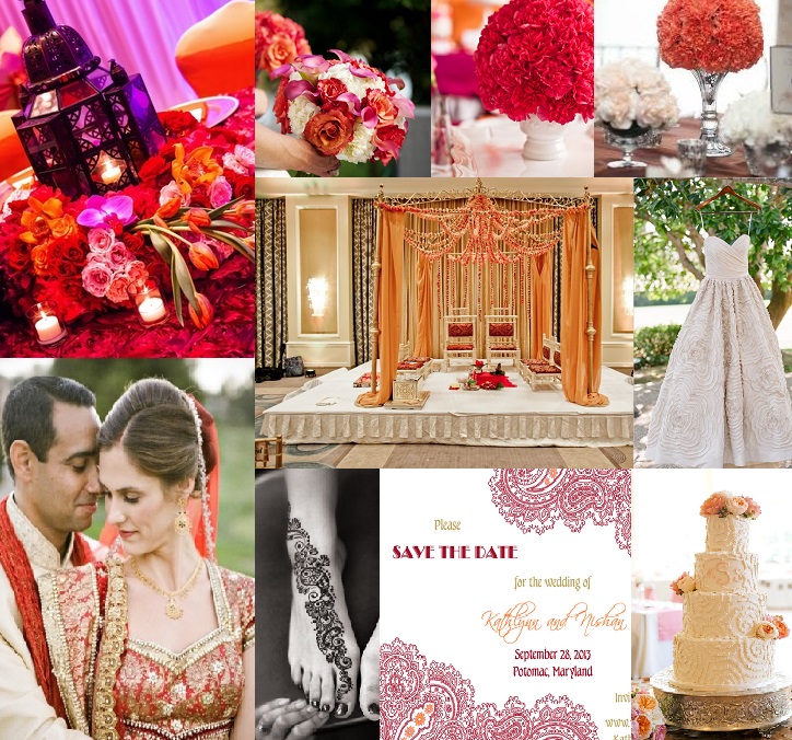 Pictures: 1) Lantern Centerpiece, gacielsantanaphotography.com 2) Bridal Bouquet, thefrenchbouquettulsa.com 3) Red Pomander Centerpiece, veryrosenberry.com 4) Orange Pomander Centerpiece, handmakerofthings.com 5) Bridal Gown, weddingchicks.com, 6) Wedding Cake, media-cache-ec0.pinimg.com 7) Save the Date, dearemmastationery.com 8) Henna, terroraisa.tumblr.com 9) Bride and Groom, stylemepretty.com 10) Mandap, sanfrancisco.fourseasons.com,