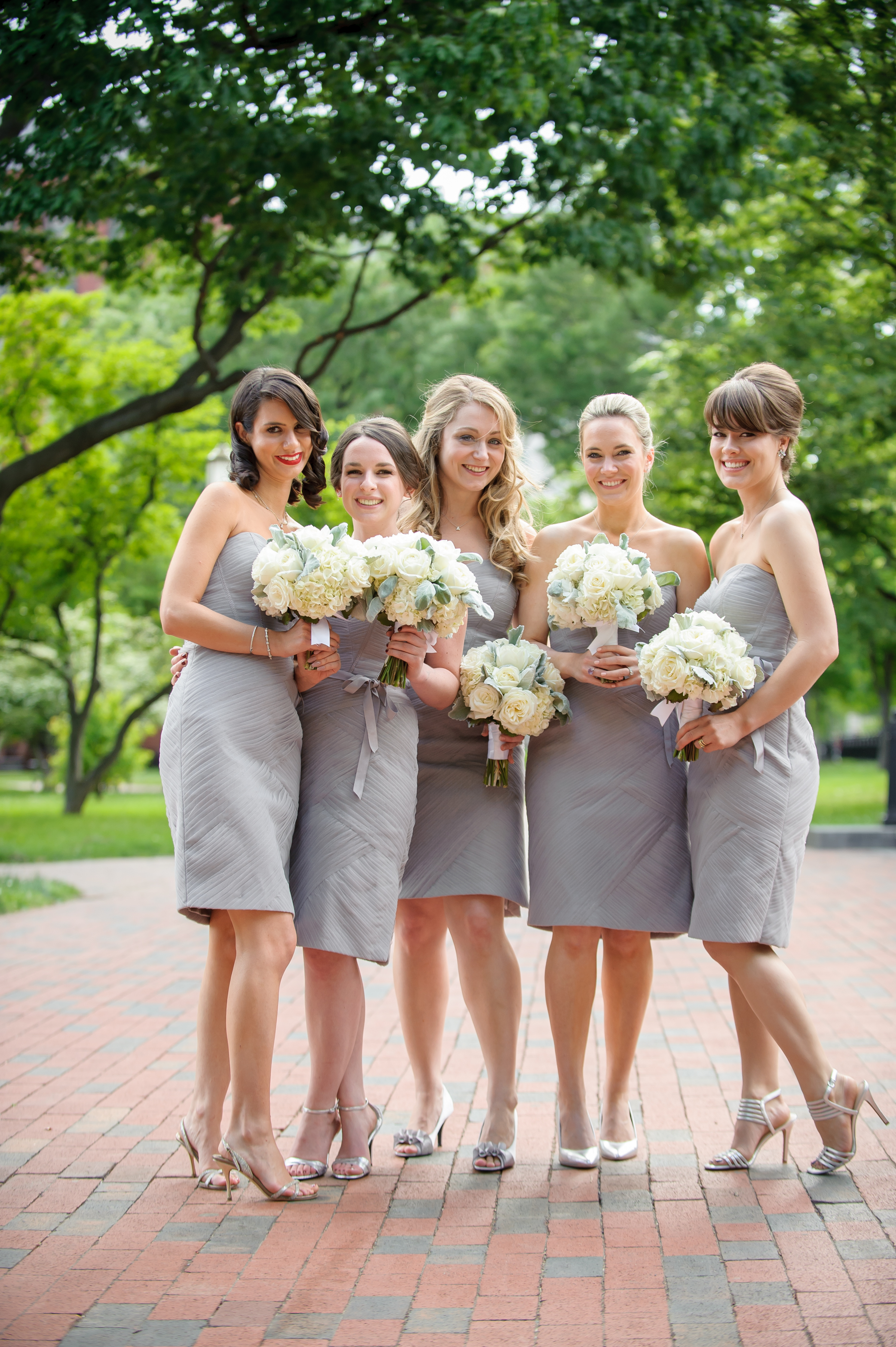 Jordan’s bridesmaids included longtime friends and her sister-in-law. I loved their dove gray Monique Lhuillier bridesmaids dresses. The white bouquets with touches of gray foliage from Edge Floral were a perfect accessory.