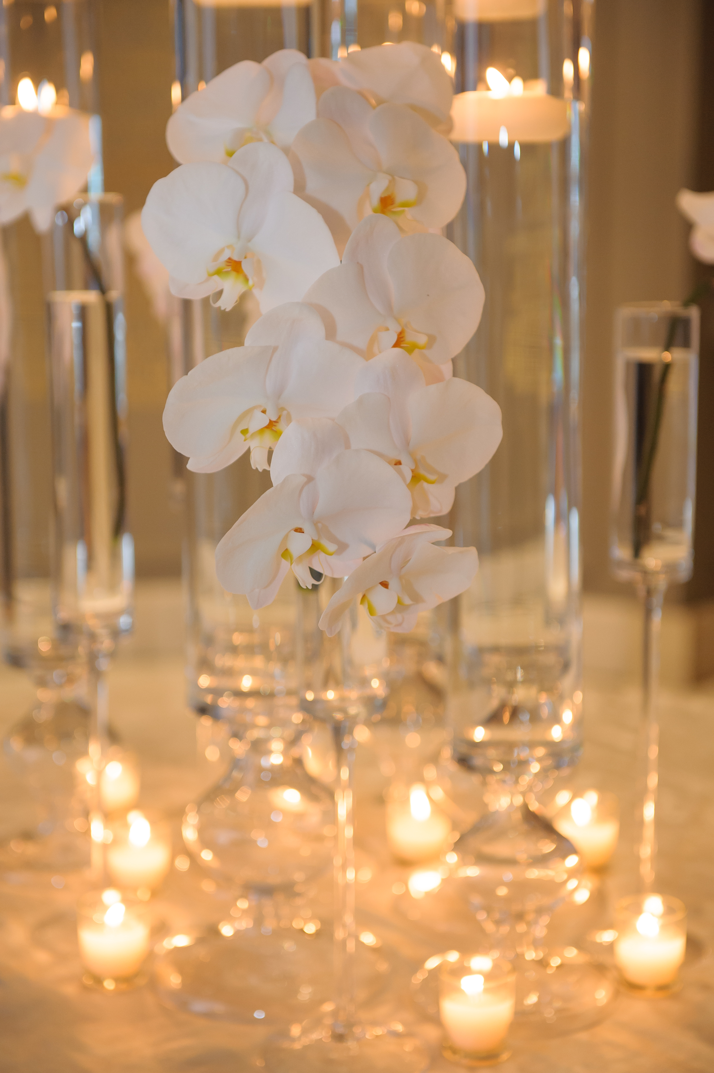 During cocktail hour the space was transformed for dinner. We incorporated a mix of round and square guest tables and a dramatic King’s table for the Wedding Party. To keep things modern and sophisticated we used all white flowers. The gray patterned linens and ivory napkins made the white really pop. The mix of tall floating candles and gorgeous orchids on the head table created an elegant tablescape.