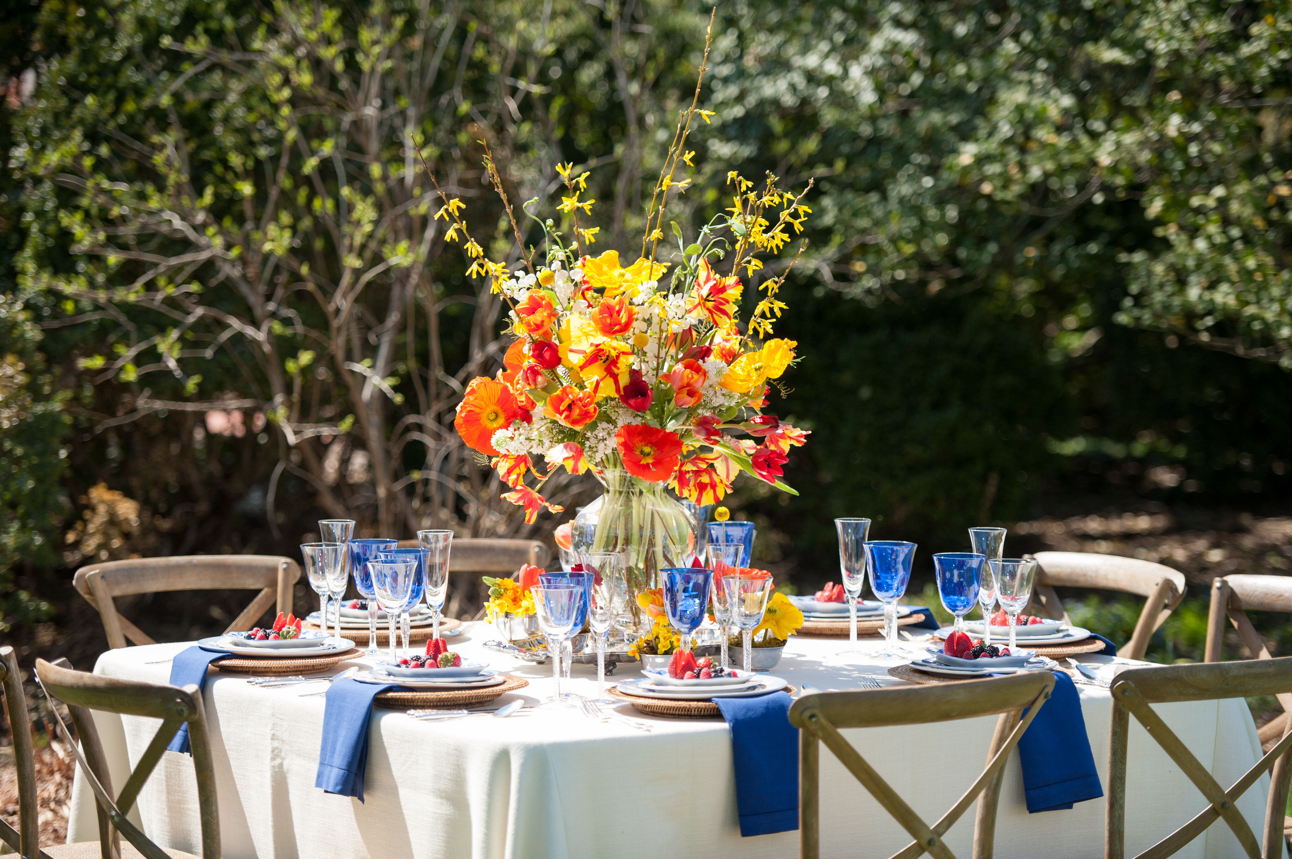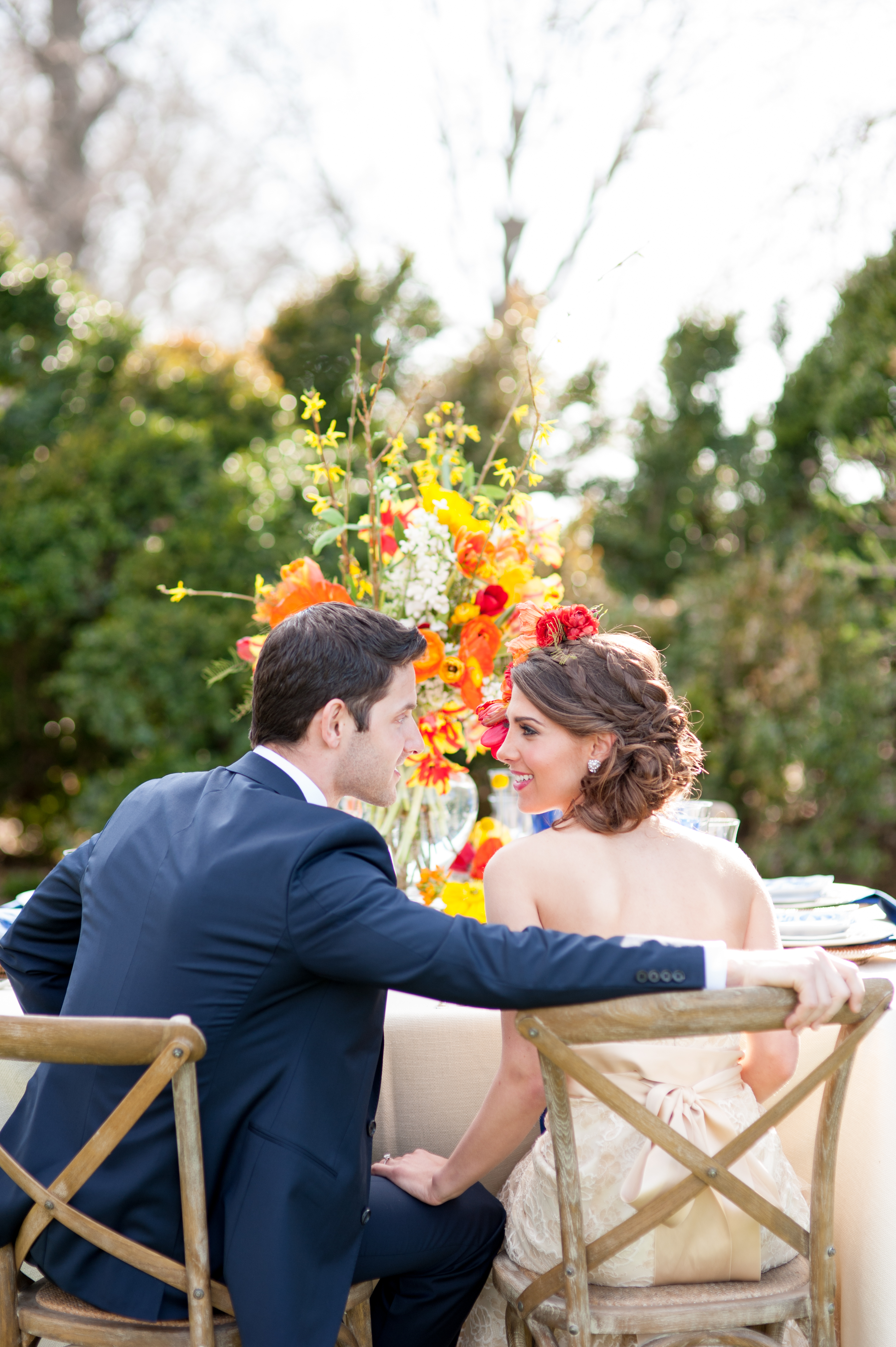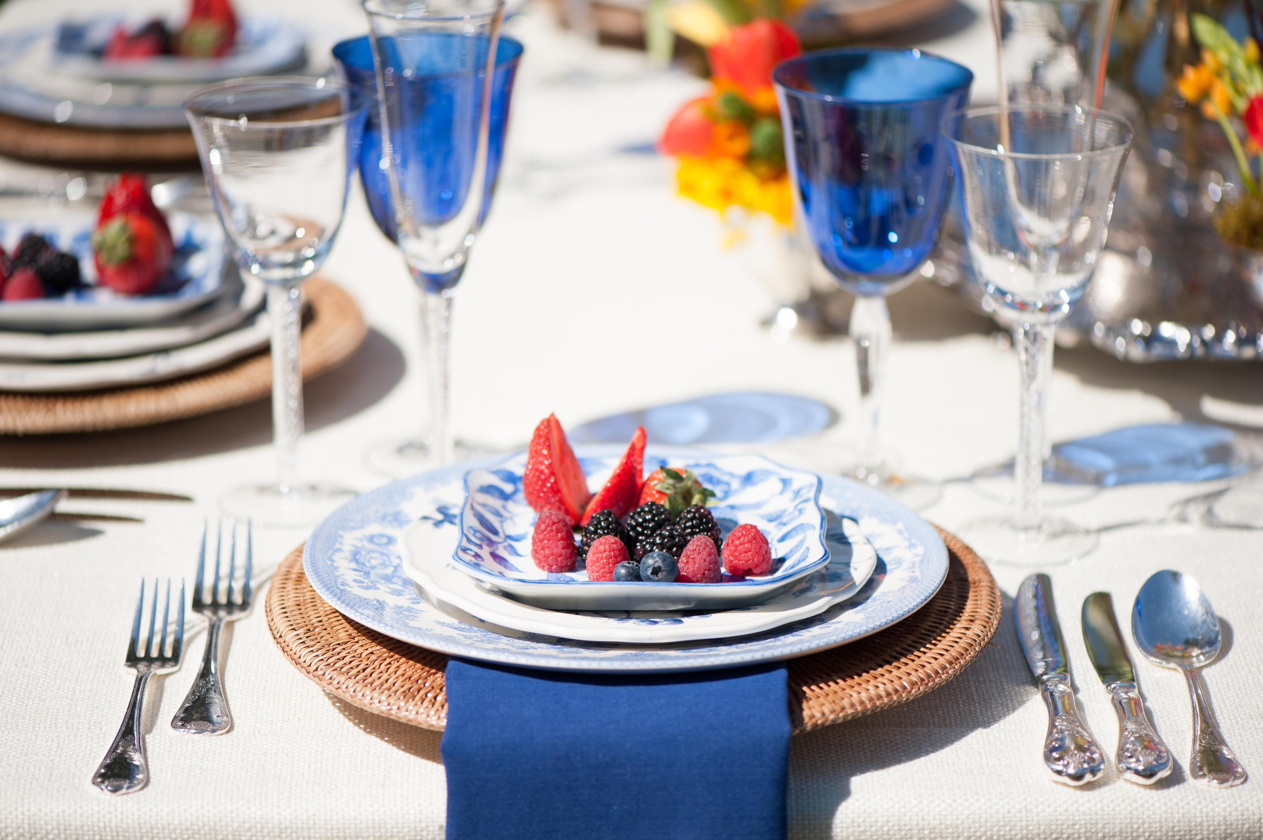 One of my favorite parts of any wedding is the reception space and specifically designing beautiful tables. We set our main table al fresco and combined delft china patterns with blue glassware and bright blooms. The cream jute linen, royal blue napkins and tuscan chairs were a perfect compliment.