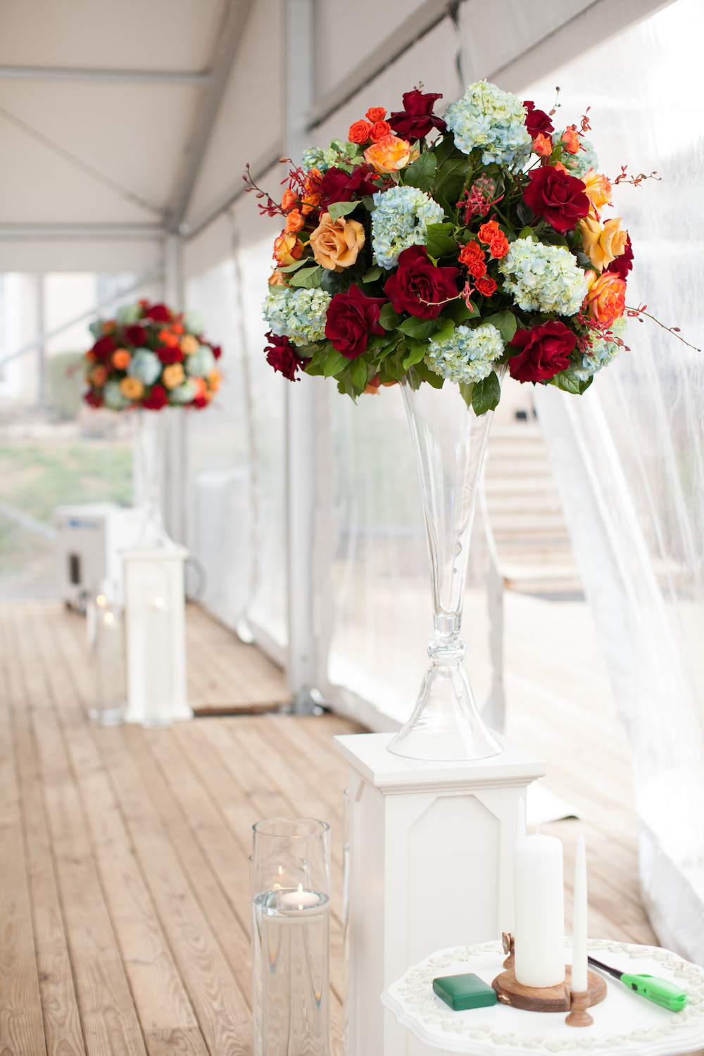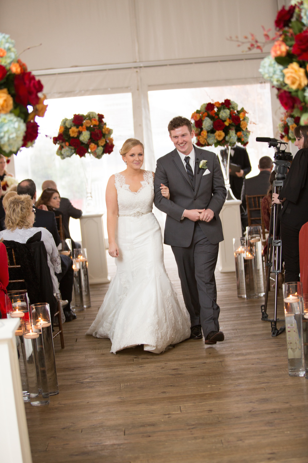 Due to the cold weather on their late November wedding day, we held the ceremony in the heated tent at Walker’s Overlook. The bright blooms and candles from Edge Floral Event Designers created a lovely ambiance.