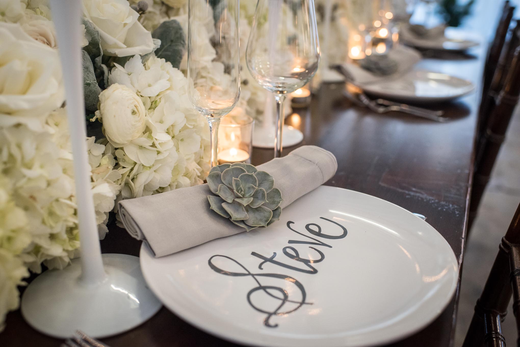 I love succulents! They are beautiful and a wonderful addition to make the place setting really pop. We paired them with the soft gray napkins to complete the look.