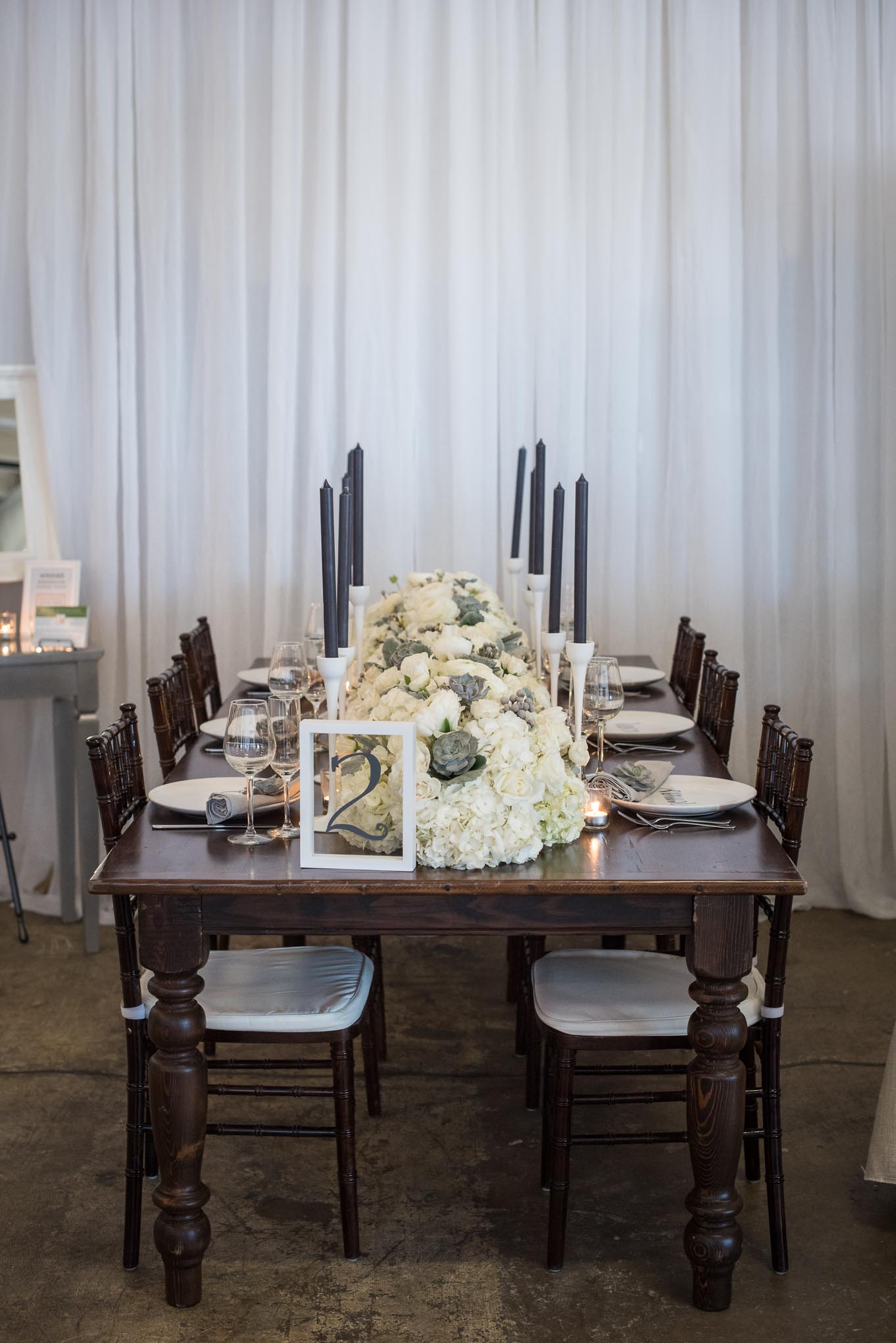 The show was held at Dock 5 in Union Market, a space that is industrial cool with exposed brick, high ceilings, bistro lighting and large glass garage doors that open the space to it’s own outside dock and private alley. It’s got a great mix of an urban feel with timeless elegance. To carry that juxtaposition through this look, I wanted to create a table that was timeless, yet modern. The touches of rustic chic elements also added another level and is a trend that is here to stay. White flowers are always lovely and classic, adding in touches of gray and green and set on top of a rustic (vintage) farm table is a stunning result! Thanks to all the vendors who contributed (see the full list below) and to our friend Emily Clack for stopping by to photograph our table.
