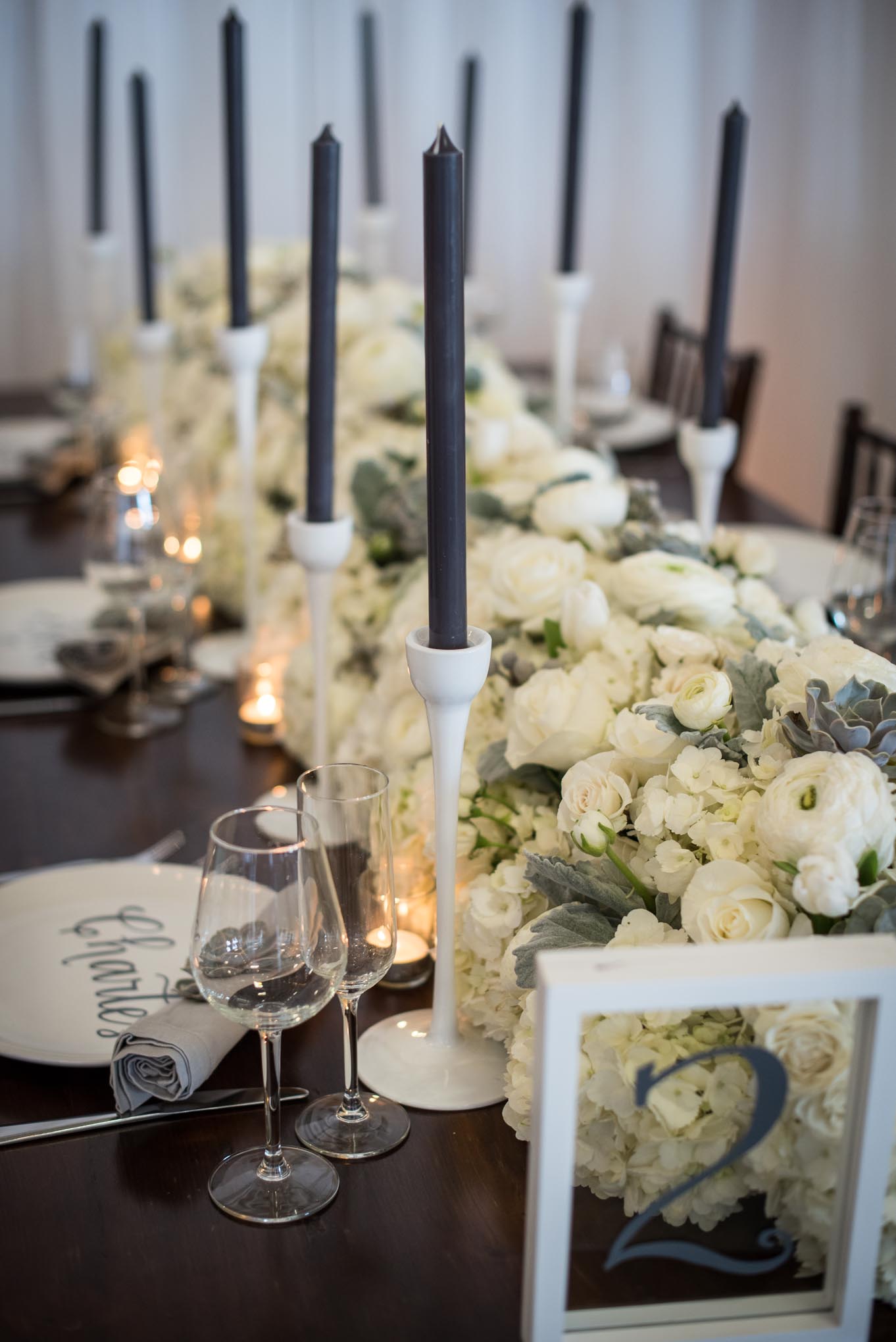 Candlelight is hugely popular and definitely a trend that is here to stay. We kept the flowers long, lush and low with tall candles. Instead of traditional white candles, we used gray candles with modern white candle holders.
