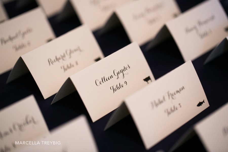 Escort cards by The Dandelion Patch included small stamps to show the meal choice (cow, fish, carrot).